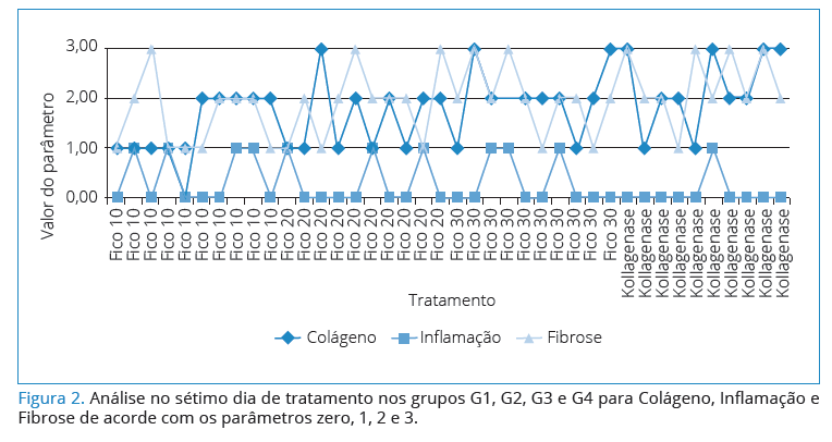 10%); G2 (Ficocianina 20%); G3 (Ficocianina 30%) e G4 (Controle positivo - Kollagenase®). Essas lesões foram analisadas