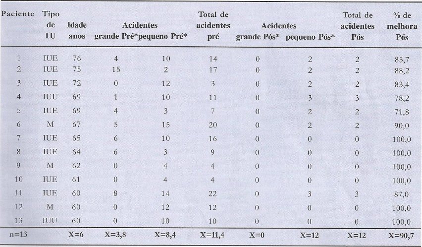 IUE: Incontinência Urinária de Esforço IUU: Incontinência Urinária de Urgência; M: Incontinência Urinária de Esforço + Incontinência Urinária de Eermegência Nessa tabela, podemos notar que todas as mulheres reduziram as perdas urinárias ou alcançaram continência plena após o programa de seis visitas ao ambulatório de enfermagem em urologia, onde foi realizada a TC. Cerca de 46% das pacientes ficaram continentes (n = 6), ou seja, o delta percentual de melhora (”%) foi de 100%. As demais pacientes apresentaram melhoras (n = 7), cujo percentual variou de 71,8% a 90,0%.Pudemos observar ainda que a média de grandes acidentes no início do tratamento era de 3,8 e de pequenos acidentes 8,4 (média total de acidentes pré-tratamento foi de 11,4). No entanto, após a TC não houve nenhum episódio de grande acidente e a média de pequenos acidentes foi de 1,2, correspondendo à média do total de acidentes pós-tratamento.Após o término do período de tratamento (seis semanas), todas as pacientes aprovaram a terapia comportamental, com apreciações que variaram de 80 a 100, com média de 90 numa escala de 0 a 100. Somente 15,4% das pacientes (n * M: Incontinência Urinária de Esforço + Incontinência Urinária de Urgência Nessa tabela, podemos notar que todas as mulheres reduziram as perdas urinárias ou alcançaram continência plena após o programa de seis visitas ao ambulatório de enfermagem em urologia, onde foi realizada a TC. Cerca de 46% das pacientes ficaram continentes (n = 6), ou seja, o delta percentual de melhora (”%) foi de 100%. As demais pacientes apresentaram melhoras (n = 7), cujo percentual variou de 71,8% a 90,0%. Pudemos observar ainda que a média de grandes acidentes no início do tratamento era de 3,8 e de pequenos acidentes 8,4 (média total de acidentes pré-tratamento foi de 11,4). No entanto, após a TC não houve nenhum episódio de grande acidente e a média de pequenos acidentes foi de 1,2, correspondendo à média do total de acidentes pós-tratamento. Após o término do período de tratamento (seis semanas), todas as pacientes aprovaram a terapia comportamental, com apreciações que variaram de 80 a 100, com média de 90 numa escala de 0 a 100. Somente 15,4% das pacientes (n= 2) solicitaram novos recursos comportamentais, ou seja, foram mulheres que não atingiram a continência (pacientes 5 e 11 – Tabela 2) e preferiram fazer o “ajuste fino”, por mais quatro semanas, com os cones vaginais(17).5. DiscussãoA incontinência urinária é caracterizada pela perda involuntária de urina pela uretra, em situações diversas e objetivamente demonstradas, causando freqüentemente um problema social e de higiene(2,10).É um problema de elevada repercussão, impacto clínico, social e psicológico, sendo causa significativa de invalidez e dependência, sobretudo em idades mais avançadas. Estimativas de sua ocorrência dependem muito da população estudada e dos critérios estabelecidos para sua definição, não havendo dados precisos da sua ocorrência e prevalência na população brasileira(18).Segundo a International Continence Society Comite on Standardisation of terminology(19), o termo IU de esforço (IUE) refere-se à perda involuntária de urina decorrente de um aumento da pressão intra-abdominal, na ausência de contrações detrusoras. Diferencia-se da perda urinária associada à urgência miccional (IUU), com ou sem contrações da musculatura do detrusor, conhecida como incontinência por urgência. A associação de ambas é chamada de incontinência mista.Atualmente existem várias formas de tratamento, incluindo-se o tratamento cirúrgico, farmacológico e a terapia comportamental, sendo esta última reconhecida pelos países de primeiro mundo como a terapêutica de início, por ser efetiva, pouco dispendiosa e sem efeitos colaterais(6,7,9).Os resultados deste estudo mostraram que a TC é um método eficaz e confiável para ser aplicado no tratamento da IU e para alguns autores, mais aceito que o farmacológico, pois não apresenta efeitos adversos. Depende da motivação do enfermeiro em adaptar o programa de terapia comportamental ao paciente e da própria Incontinência disposição da mulher em seguir as intervenções propostas(1,6,9).Nosso trabalho mostrou que todas as pacientes referiram que a IU prejudicava a qualidade de vida diária (100%), restringindo suas atividades. Alguns pesquisadores definem qualidade de vida como uma situação multidimensional relacionada às percepções individuais e as circunstâncias da vida diária, podendo ser interpretada diferentemente de indivíduo para indivíduo(19).A IU favorece o desajuste social e individual, tanto na vida do incontinente quanto na família e cuidadores. Resulta em perda da auto-estima e diminuição da habilidade em manter-se em uma vida independente e construtiva, resultando em gradativa diminuição da qualidade de vida. A dependência de um cuidador para a realização das atividades diárias aumenta assim que a incontinência urinária se acentua. Conseqüentemente, a interação social com a família e amigos e até mesmo a atividade sexual tornam-se restritas ou totalmente abolidas(1,6,9).Os custos relacionados ao manuseio da IU são elevados(6). A maioria de nossas pacientes estava acostumada a utilizar absorventes higiênicos para conter a IU. Todavia, 46,1% das idosas referiram usar “toalhinhas íntimas”, constituídas de diversos tecidos, para prevenir extravasamento de urina. Estudo norte-americano tem mostrado que os custos com a IU podem ser superiores a $11,2 bilhões de dólares anualmente na comunidade, em torno de $5,2 bilhões com idosos institucionalizados, e individualmente o idoso pode vir a desembolsar mais de mil dólares mensalmente com acessórios para driblar a incontinência urinária(6).É freqüente observarmos mulheres queixando-se de IU quando expostas ao estresse(1). Os resultados deste trabalho mostraram que 38,6%