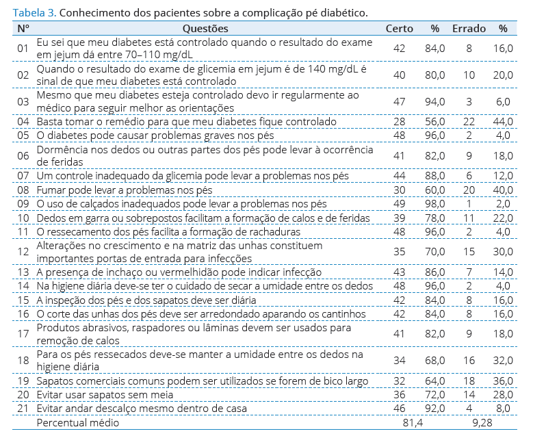 O percentual médio de acerto quanto ao conhecimento sobre a complicação pé diabético foi de 81,4% (Tabela 3), e os maiores percentuais de erro foram encontrados nas questões relacionadas a: controle da doença (questão 4: 44%), hábito de fumar (questão 8: 40%) e sapatos adequados (questão 19: 36%).